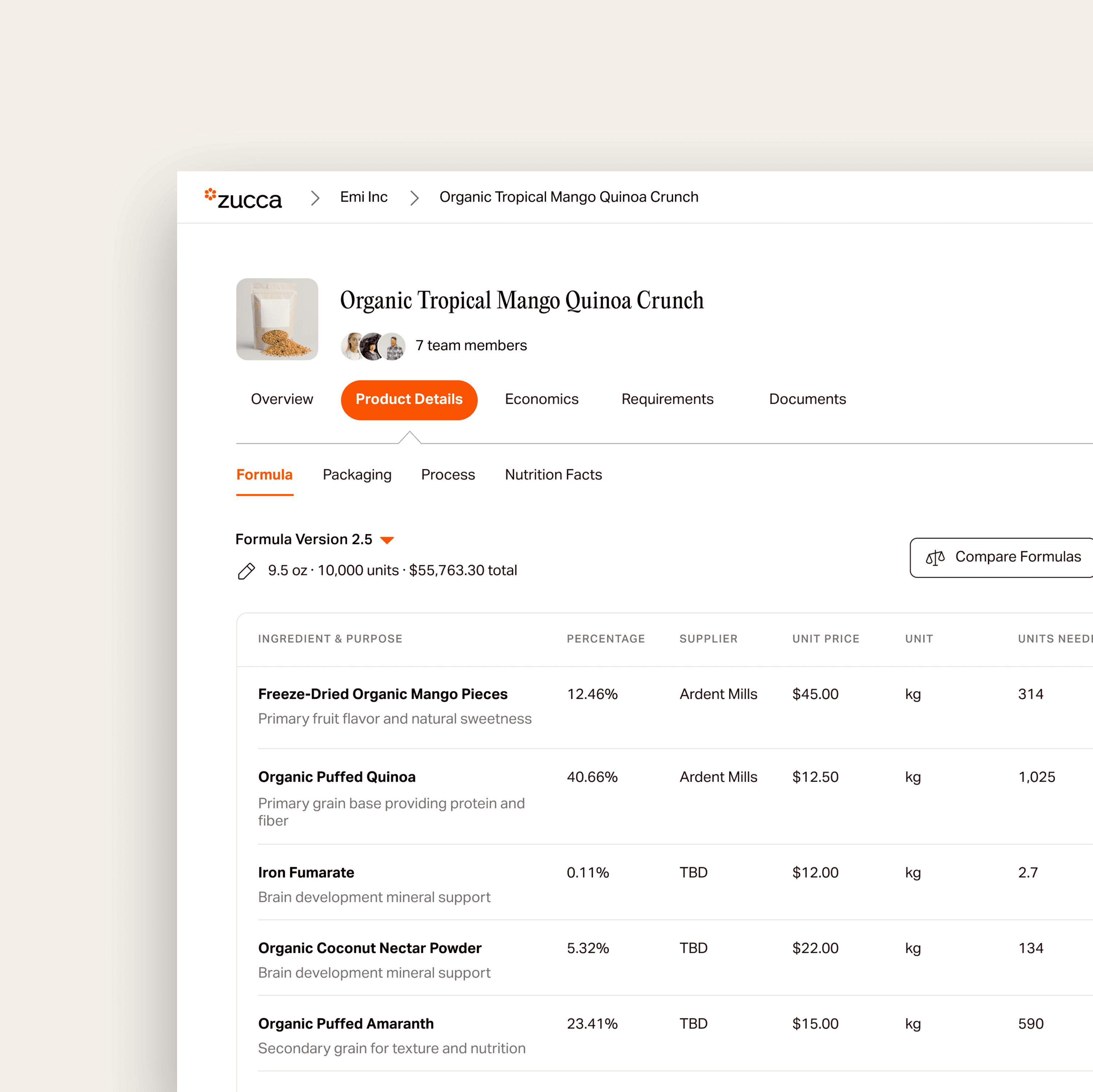 Zucca uses your real ingredients data to formulate, generate NFPs, estimate costs, and more.